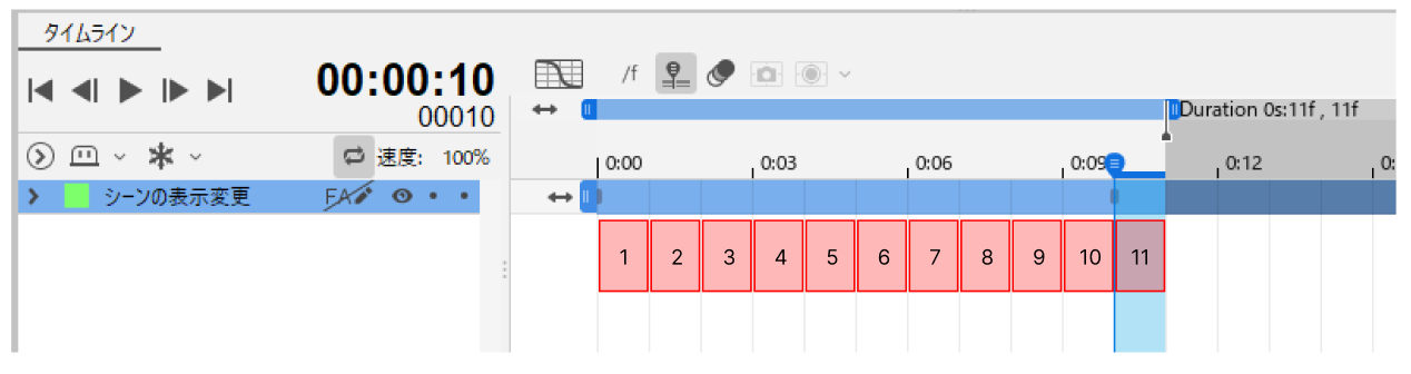 シーンとしては、下図の不透明の赤色で示した範囲までが最終キーフレームとなりますので、表示は10fまでのように見えていますが、実際の最終フレームは11fとなります。