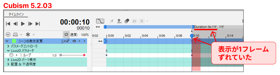 Cubism 5.2.03 までは、「Duration」の範囲を表すグレー部分の表示だけが1フレーム前にずれていした。