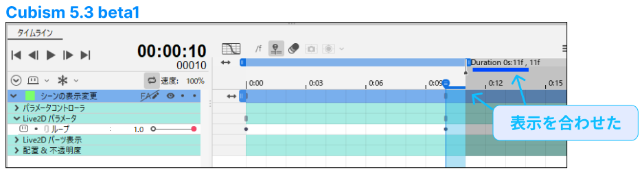 Cubism 5.3beta1から「Duration」の範囲表示(グレー部分)をシーンの長さに合わせました。